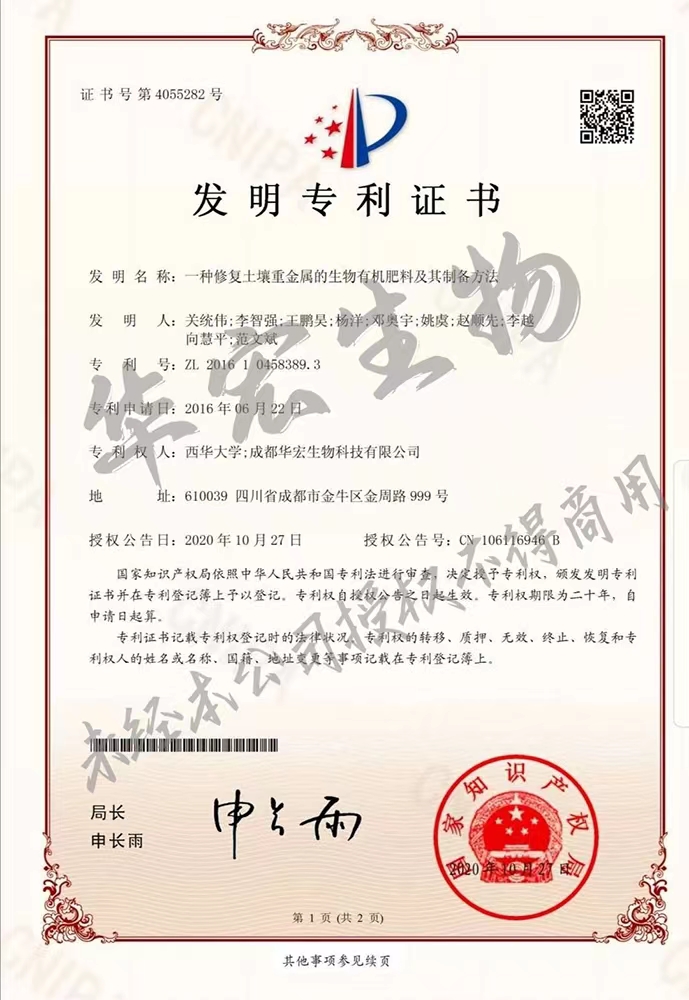 一種修復(fù)土壤重金屬的生物有機(jī)肥料及其制備方法專利證書